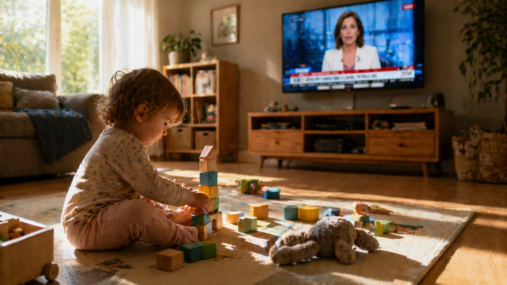 The effects on play are immediate and observable. In controlled studies, children's focused play episodes become shorter and less complex when a television is running, even when the children glance at the screen less than 5 percent of the time [3]Schmidt et al. 2008, Child Development — Effects of background TV on play qualityhttps://pubmed.ncbi.nlm.nih.gov/18662115/. The audio pulls at their attention in irregular intervals. They don't watch, but they can't fully ignore it either. The result is a kind of fractured attention that undermines the sustained, exploratory play that matters most for development.